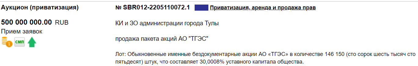 Администрация Тулы возобновила попытки продажи трети акций «Тульских городских электрических сетей». Речь идет об аукционе на обыкновенные именные бездокументарные акции «ТГЭС» в количестве 146 150 штук, что составляет 30,0008% уставного капитала общества.