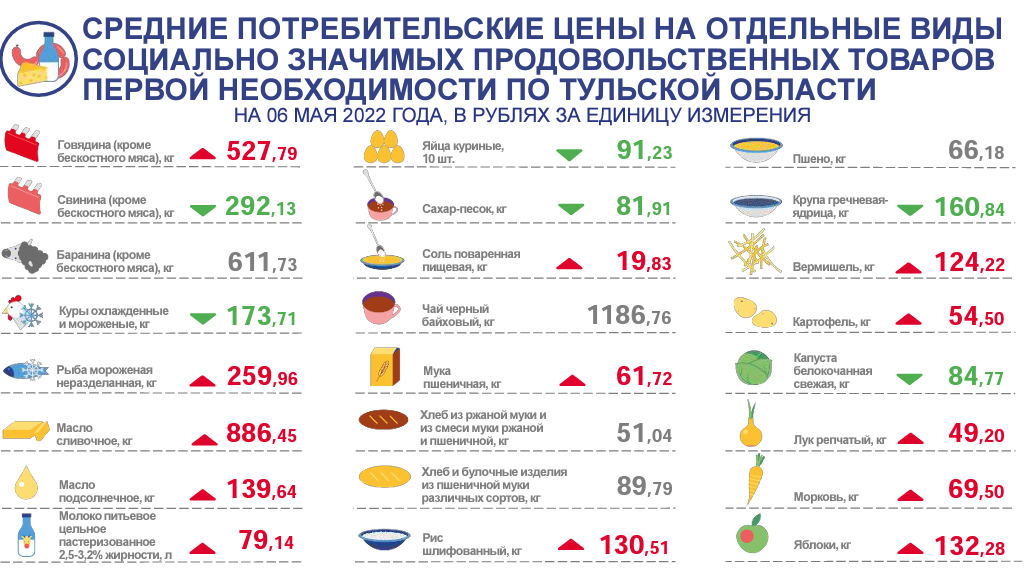 В то же время в Тульской области наблюдается снижение стоимости на огурцы (минус 6,84%, цена 138,56 рубля), куриные яйца (минус 2,72% до 91,23 рубля) и белокочанная капуста (минус 1,77% до 84,77 рубля за килограмм).