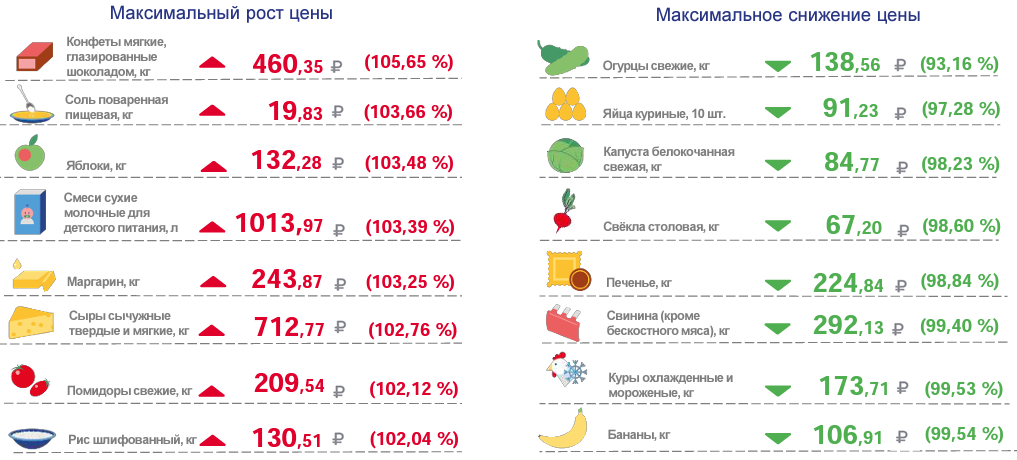 По данным на 6 мая, максимальный рост с 29 апреля по 6 мая в регионе продемонстрировали мягкие глазированные шоколадные конфеты (цена выросла на 5,65% до 460,35 рубля), пищевая поваренная соль (на 3,66% до 19,83 рубля), яблоки (на 3,48% до 132,28 рубля), сухие детские молочные смеси (на 3,39% до 1013,97 рубля), маргарин (на 3,25% до 243,87 рубля), а также сыры, свежие помидоры и шлифованный рис.