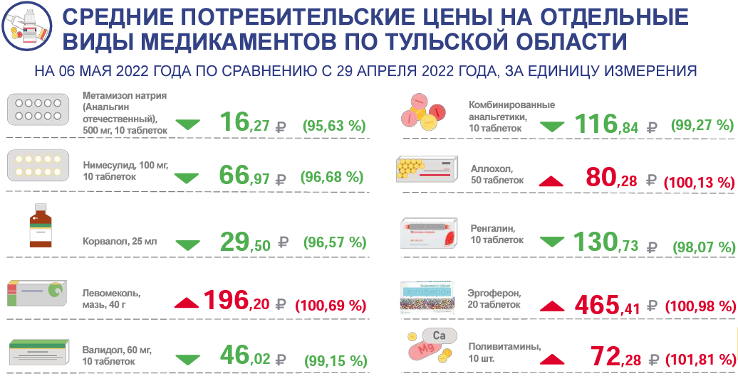 Также «Туластат» проанализировал средние потребительские цены на отдельные виды медикаментов. В сравнении с 29 апреля в регионе незначительно (рост меньше 1%) подорожали мазь «Левомеколь», таблетки «Аллохол» и таблетки «Эргоферон». На 1,81% в цене выросли поливитамины.