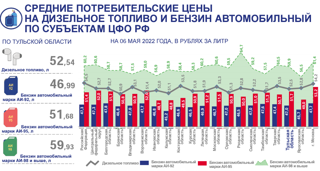 Литр бензина в Тульской области, по данным на 6 мая, стоит 46,99 рубля (АИ-92), 51,68 рубля (АИ-95), 59,93 рубля (АИ-98 и марки выше). Литр дизеля в среднем обходится тульским автомобилистам в 54,54 рубля.