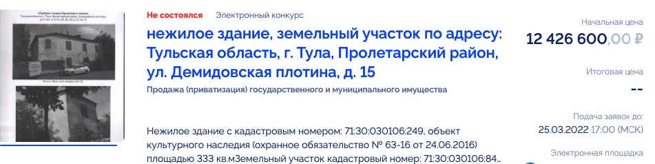 Аукцион по продаже здания бывшей «Пробной галереи Оружейного завода» в Пролетарском районе Тулы не состоялся: для участия в конкурсе не подали ни одной заявки.
