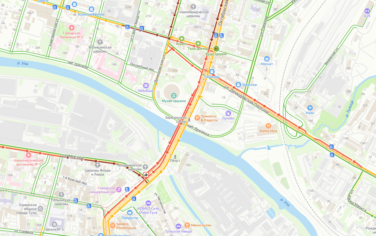 Затор начинается на Зареченском мосту. В социальных сетях очевидцы пишут, что одному из водителей во время движения стало плохо. Пожилому мужчине вызвали скорую.