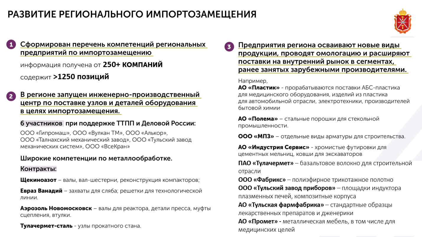 Уже получено 143 заявки от тульских компаний на разработку документации, мы их направили в агентство технологического развития. Если комиссия оценивает их [заявки] как значимые для российской промышленности, то они попадают на конкурс, далее разрабатывается документация и после этого запускается производство. Вся логика реинжиниринга в том, чтобы: во-первых, выявить те ниши, в которых мы можем быстро добиться замещения, во-вторых, определить ниши, где российские аналоги и технологические возможности отсутствуют и нужно запускать стратегические проекты, создавать новые производства.