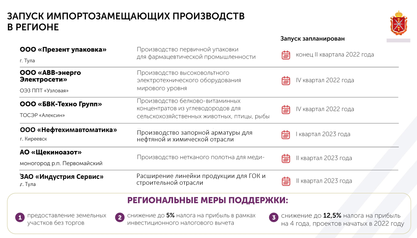 Сейчас в регионе готовятся к запуску новые производства, которые будут направлены именно на импортозамещение. ООО «Презент Упаковка», к примеру, будет выпускать первичную упаковку для фармацевтической промышленности. ООО «БВК-Техно Групп», расположенное в ТОСЭР «Алексин», — белково-витаминные концентраты из углеводородов для сельскохозяйственных животных, птиц и рыб.