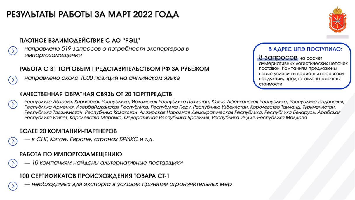 Отдельного внимания заслуживает работа с Торговыми представительствами РФ за рубежом. В 31 Торгпредство направлено около 1 000 позиций на английском языке и более 5 000 — на русском. В лидерах по взаимодействию на данный момент находятся Белоруссия и Армения.
