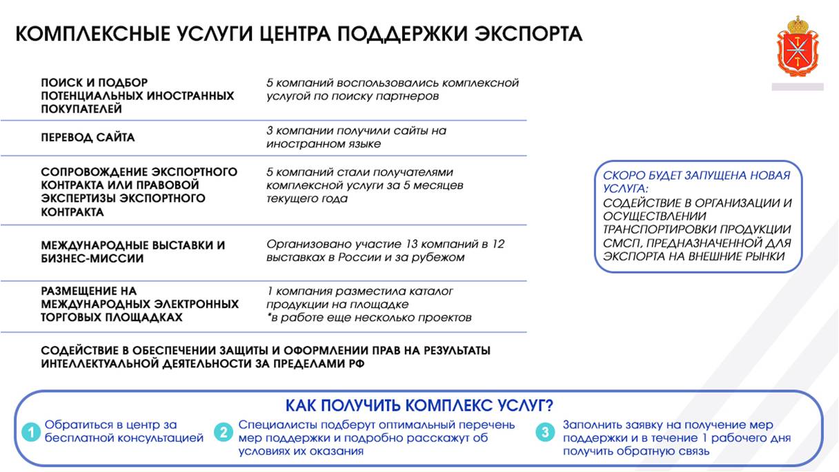 Если покупатель найден, то мы предлагаем для экспортеров комплексную услугу по сопровождению экспортного контракта, которая включает подготовку проекта экспортного контакта или правовую экспертизу имеющегося, расчет логистики, адаптацию упаковки товара и консультации по налогообложению, например, возврату НДС. Этой услугой также воспользовались 5 компаний.
