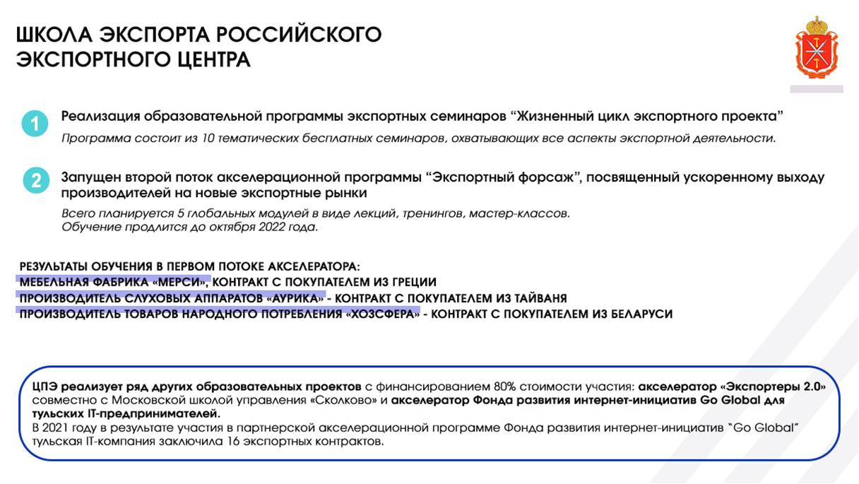 Запущен второй поток акселерационной программы «Экспортный форсаж» для ускоренного выхода производителей на новые экспортные рынки. Акселератор состоит из 6 образовательных двухдневных модулей и межмодульных периодов для индивидуальной работы с наставниками.Так, в результате работы первого потока, который завершился весной этого года, тремя тульскими компаниями из десяти уже заключены экспортные контракты.
