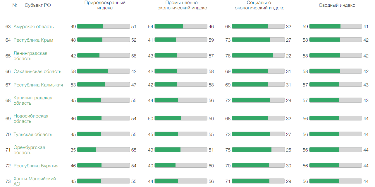 Тульская область за весну поднялась на две строчки (годом ранее субъект занимал 72-е место). Природоохранный индекс региона 45/55, промышленно-экологический — 45/55, социально-экологический — 73/27, сводный экологический — 56/44.