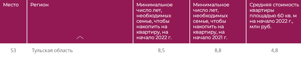Тульская область заняла 53 место в рейтинге по доступности приобретения жилья. Жителям региона понадобится минимум 8,5 лет, чтобы накопить на собственную квартиру или дом. Для сравнения: в 2021 году потребовалось бы 8,8 лет.