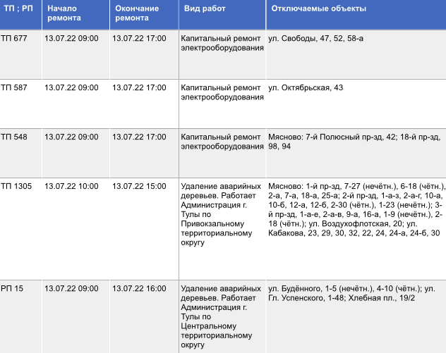 В среду, 13 июля, часть Тулы останется без света из-за плановых работ. Электричество отключат на улицах Свободы, Октябрьская и Буденного, а также в поселке Мясново.