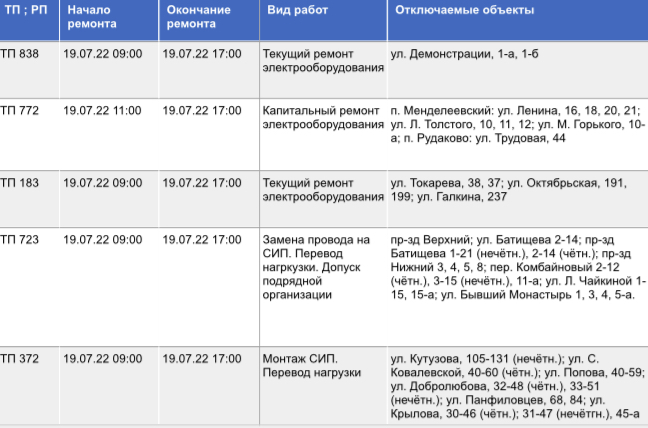 На указанных адресах будет проводиться ремонт электрооборудования, замена проводов на СИП и монтажные работы.
