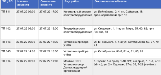 Отключения света связано с капитальным ремонтом электрооборудования, установкой приборов учета и монтажом СИП.