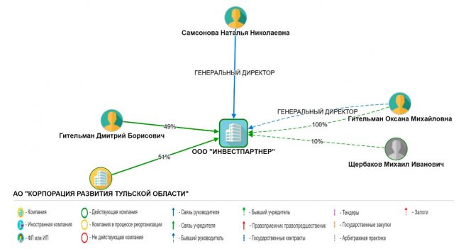 Официально юридическое лицо ООО «Инвестпартнер» было учреждено в 2012 году, а в поселок Пронь Кимовского района оно «переехало» пятью годами позже. Тут как раз начинается самое интересное: в 2016 году возглавила компанию Оксана Михайловна Гительман, урожденная — Щербакова. Ее отец (Михаил Иванович Щербаков), в прошлом — генеральный директор ООО «Торговый Дом «Медведь». Свою долю в компании получил и муж Оксаны — Дмитрий Борисович Гительман. Последний, по информации «Тульских новостей», до этого был Алексеем Владимировичем Каминским — это подтверждается скриншотом из базы данных, но почему мужчина решил полностью сменить ФИО, журналисты не раскрывают.