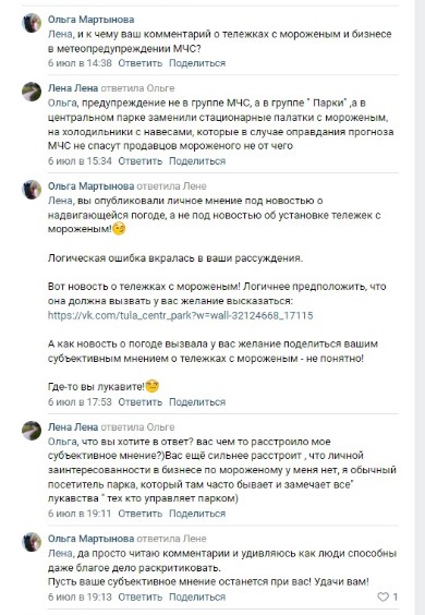 Сейчас в Центральном парке киоски в своих привычных местах стоят закрытыми, а на жалобы туляков в соцсетях на то, что воды элементарно купить негде, представители «Тульских парков» отвечают не очень-то учтиво: ищут ошибки в словах туляков и подчеркивают, что их мнение субъективно. Вот, например, так обратную связь гостям парка предоставила Ольга Мартынова, менеджер по связям с общественностью: