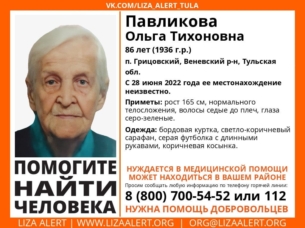 Добровольцы поискового отряда «ЛизаАлерт» продолжают поиски 86-летней Ольги Павликовой из поселка Грицовский Веневского района. В прошлый вторник, 28 июня, пожилая женщина пропала без вести — и до сих пор найти ее не удается.