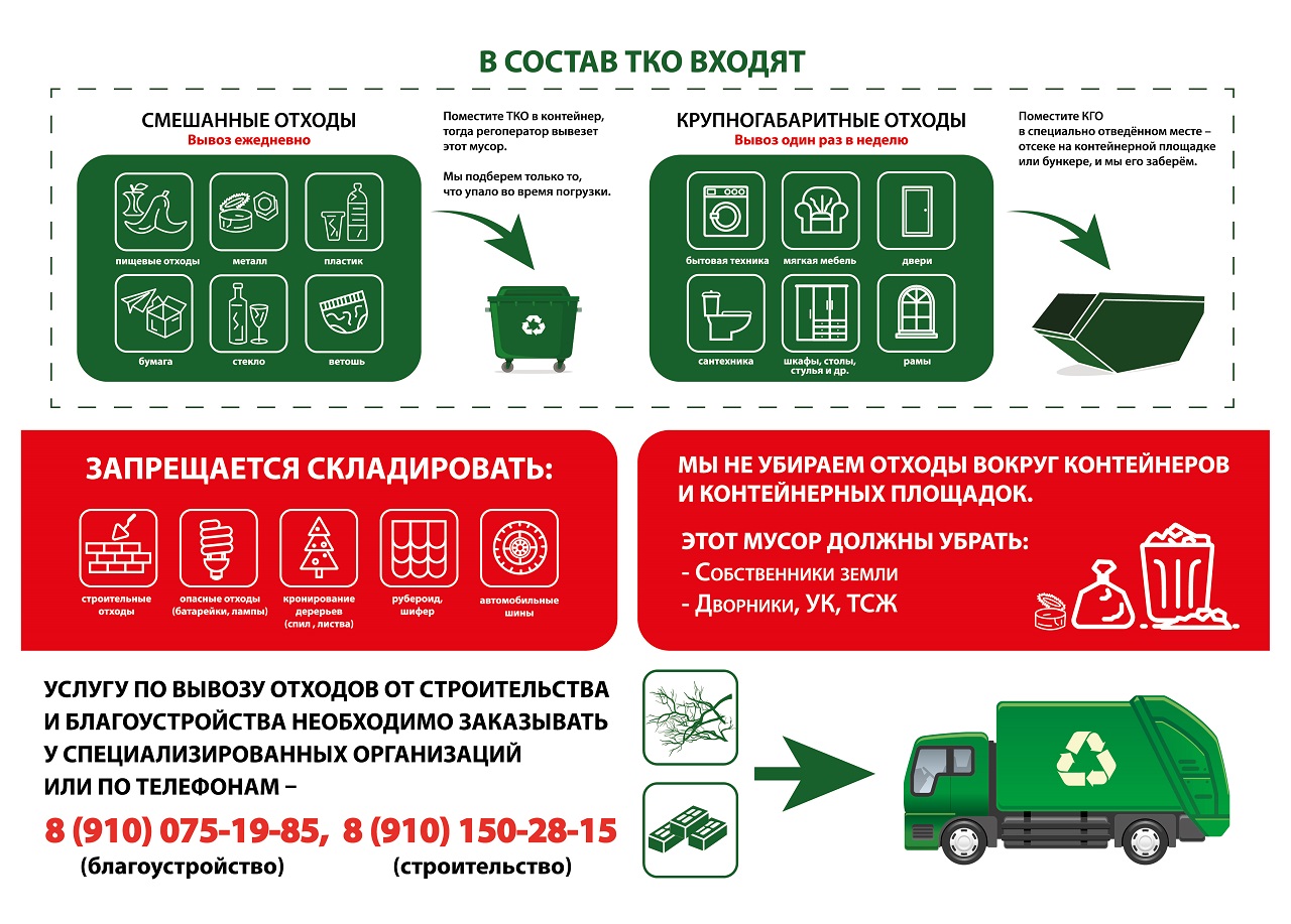 Запрещается складирование отходов от благоустройства в контейнеры и ёмкости для ТКО, так как это может привести к их поломке. Кроме того, несанкционированные навалы затрудняют вывоз бытовых отходов, создавая препятствие на пути для спецтехники и её экипажа.