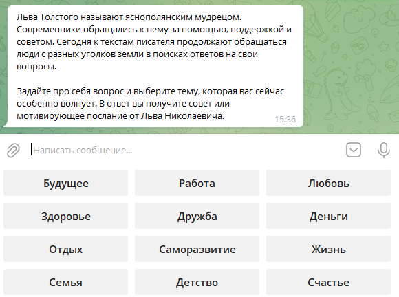 В ответ чат-бот пришлет совет или мотивирующую цитату Льва Толстого. Цитаты для бота взяты из Полного собрания сочинений писателя, которое включает не только его художественные тексты, но и дневники, письма, публицистику.