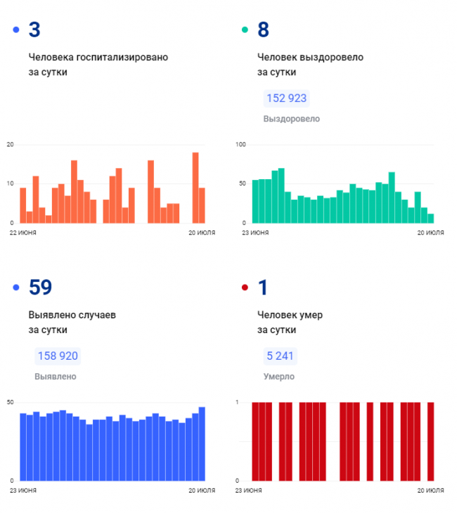 Всего с начала пандемии в регионе заболели 158 920 человек, а выздоровели — 152 923. Общее число умерших в регионе к 21 июля достигло 5 241.