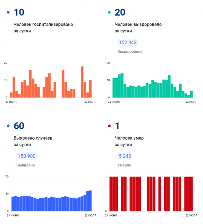 Всего с начала пандемии в регионе заболели 158 980 человек, а выздоровели — 152 943. Общее число умерших туляков к 22 июля достигло 5 242.