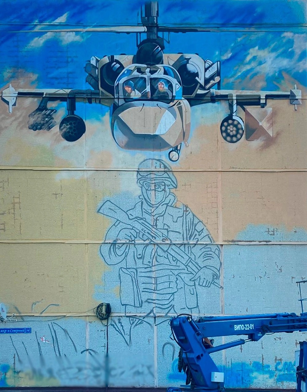 В областном центре уже есть два граффити в поддержку военных — на Казанской набережной и на улице Советской. Стену здания на Металлистов, 2-а украшает знаменитая «Бабушка с Красным флагом», за ее спиной — российские военнослужащие. На улице Советской — триколор с надписью «Своих не бросаем».