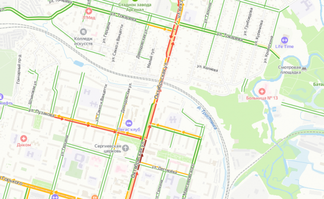 Вечер пятницы, 29 июля, туляки проводят в пробках. Как сообщают автомобилисты, улица Октябрьская «стоит». На участке от ул. М. Горького вплоть до Комсомольского парка образовался большой затор. Загруженность дорог оценивается в 6 баллов.