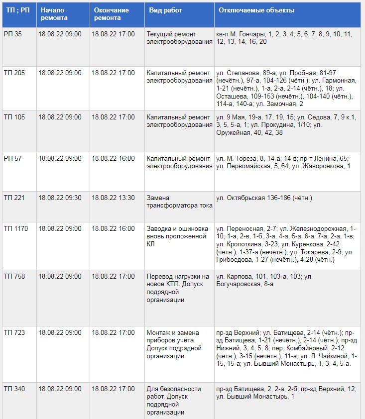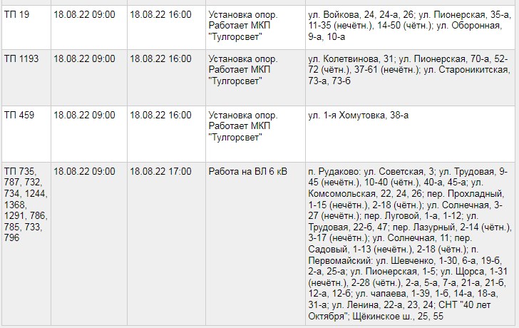 18 августа часть Тулы останется без электричества из-за плановых работ. Так, в зоне отключения окажутся улицы Степанова, Гармонная, Оружейная, Карпова, Седова и Пионерская, а также поселок Рудаково.