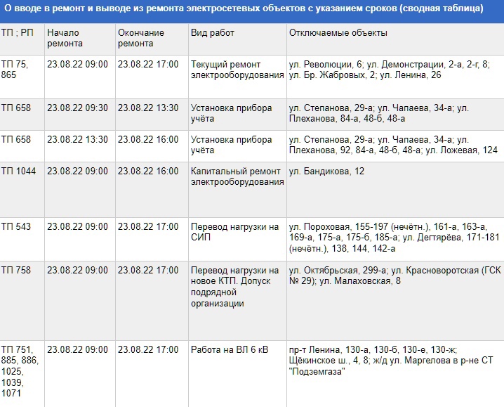 Отключения связаны с ремонтом электрооборудования и установкой прибора учета.
