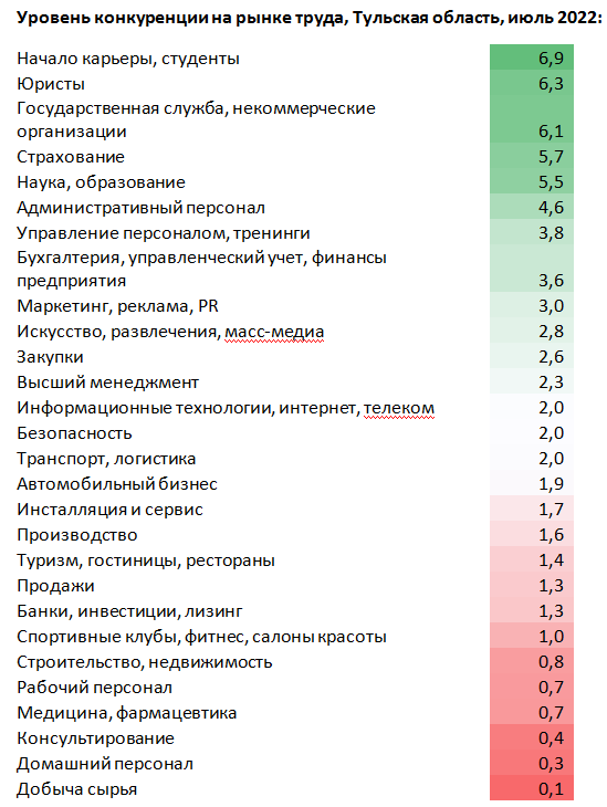 Конкуренция за рабочие места в тульском регионе также наблюдается в сферах «Юриспруденция», «Государственная служба, некоммерческие организации», «Страхование», «Наука, образование» и «Административный персонал». При этом проще всего найти работу в отраслях «Добыча сырья», «Консультирование» и «Домашний персонал».