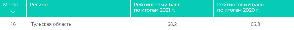 Тульская область расположилась на 16-ом месте в рейтинге, набрав 68,2 баллов по итогам 2021 года. Нашему региону удалось обойти Калугу (66,8 баллов) и Рязань (64,7).