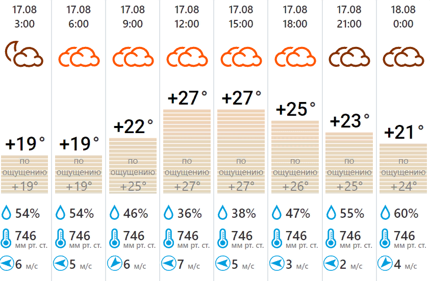 Ночью температура опустится до +21 градуса. Ветер 4 м/с, влажность воздуха 60%, атмосферное давление 746 мм рт. ст.