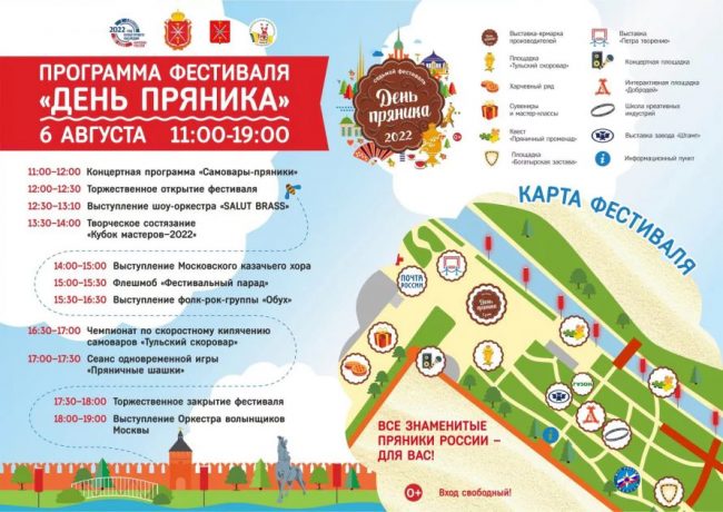 Мероприятия, приуроченные к фестивалю, начнутся уже 5 августа. В 18:00 в музее «Тульские самовары» начнется интерактивная лекция «Тула пряничная». Участников фестиваля также ждут концерты, флэшмобы, различные состязания и т.д.