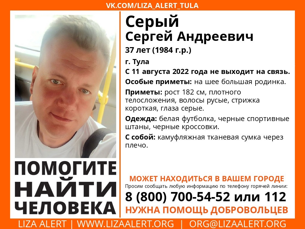В Туле волонтеры отряда «ЛизаАлерт» объявили поиск пропавшего почти неделю назад 37-летнего мужчины с большой родинкой на шее. Сергей Серый перестал выходить на связь с близкими людьми с 11 августа.