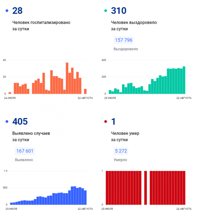 Всего с начала пандемии в регионе заболел 167 601 человек, а выздоровели — 157 796. Общее число умерших пациентов в Тульской области к 23 августа достигло 5 272.
