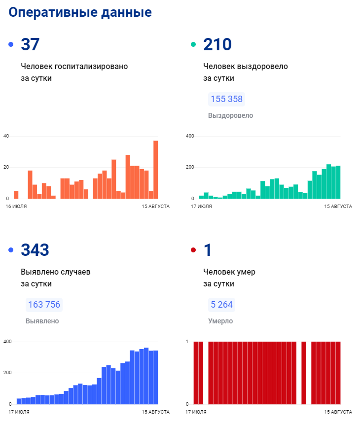 Всего с начала пандемии коронавирусом заболели 163 756 человек, а выздоровели — 155 358. Общее число умерших пациентов к 15 августа достигло 5 264.