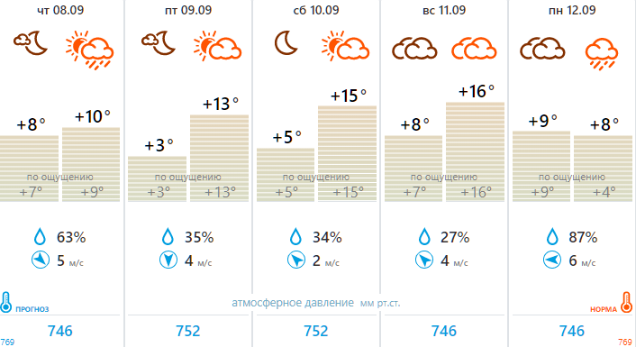 В Туле погода начнет налаживаться в пятницу, 9 сентября: дожди прекратятся, а столбики термометров поднимутся до +13. К воскресенью воздух прогреется уже до +16, однако с начала следующей недели снова начнутся осадки и небольшое похолодание.