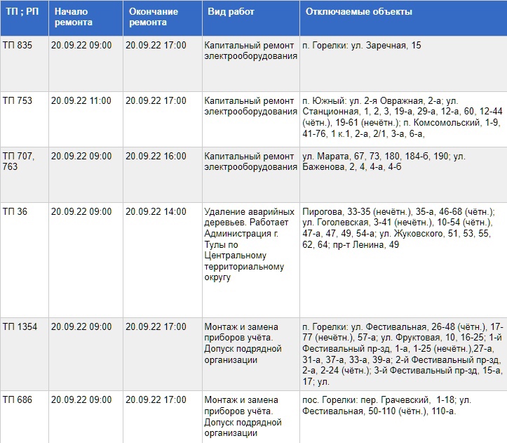 20 сентября часть Тулы останется без электричества из-за плановых работ. Так, в зону отключения войдут улицы Марата, Пирогова, Севастопольская, Ушинского и Прудная, а также поселки Горелки и Южный.