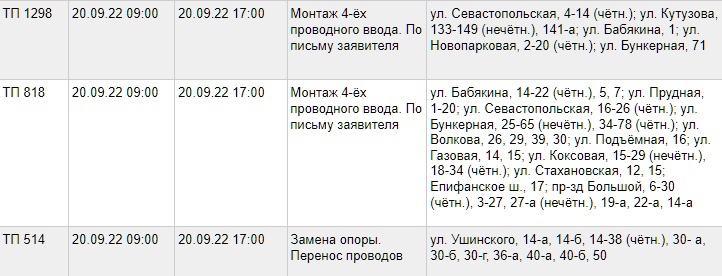 В основном отключения будут связаны с капитальным ремонтом электрооборудования, удалением аварийных деревьев, заменой опоры и монтажом приборов учета.