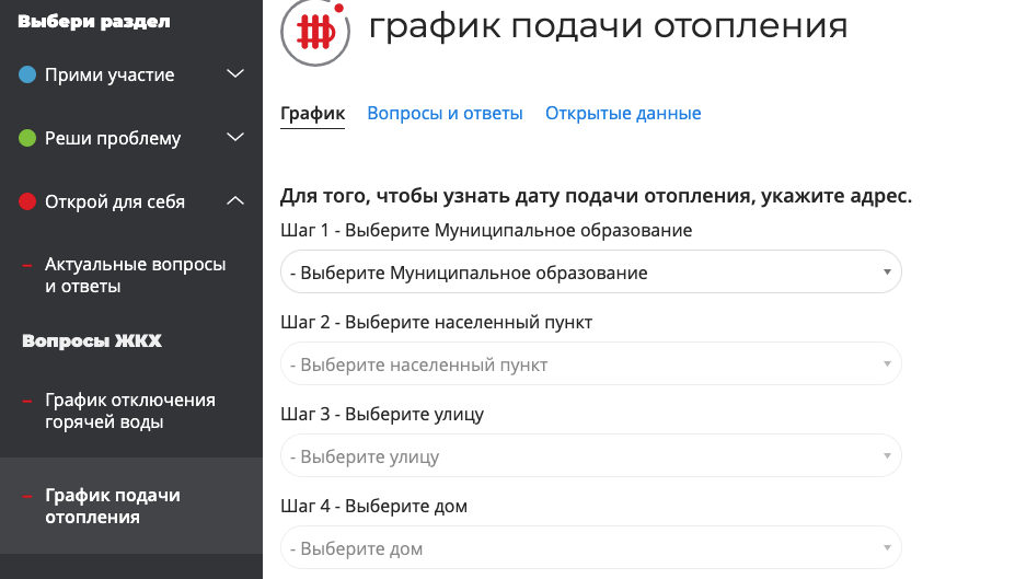 Точную дату начала отопительного сезона в своих домах жители региона могут узнать на портале «Открытый регион». Для этого нужно зайти в раздел «Открой для себя» и выбрать «Вопросы ЖКХ» — «График подачи отопления» и заполнить форму: выбрать населенный пункт, улицу и дом. Для удобства ссылка — здесь. Вместе с графиком подачи тепла портал предоставит телефон ЕДДС и администрации, а также контакты организации, обслуживающей конкретный дом.