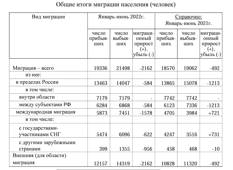 «Общий объем миграции (сумма прибытий и выбытий) с января по июнь составил 40,8 тыс. человек, что на 3,2 тыс. человек (на 8,5%) больше, чем в соответствующем периоде 2021 года. Число переселений внутри области стало меньше на 563 человека (на 7,3%)», — уточнили в Туластате.