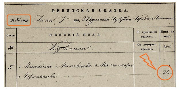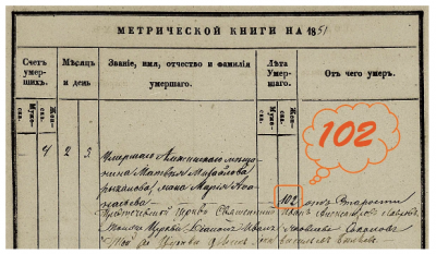 Например, мещанка города Алексина Мария Афанасьевна Рыкалова прожила целых 102 года. Но в других документах возраст женщины меньше — 84 года. А по исповедной ведомости за 1833 год и вовсе 67 лет.