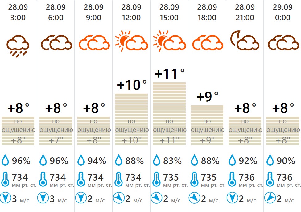 Ночью температура опустится до +8 градусов, без осадков. Влажность воздуха — 80%, атмосферное давление — 736 мм рт. ст., ветер 2 м/с.