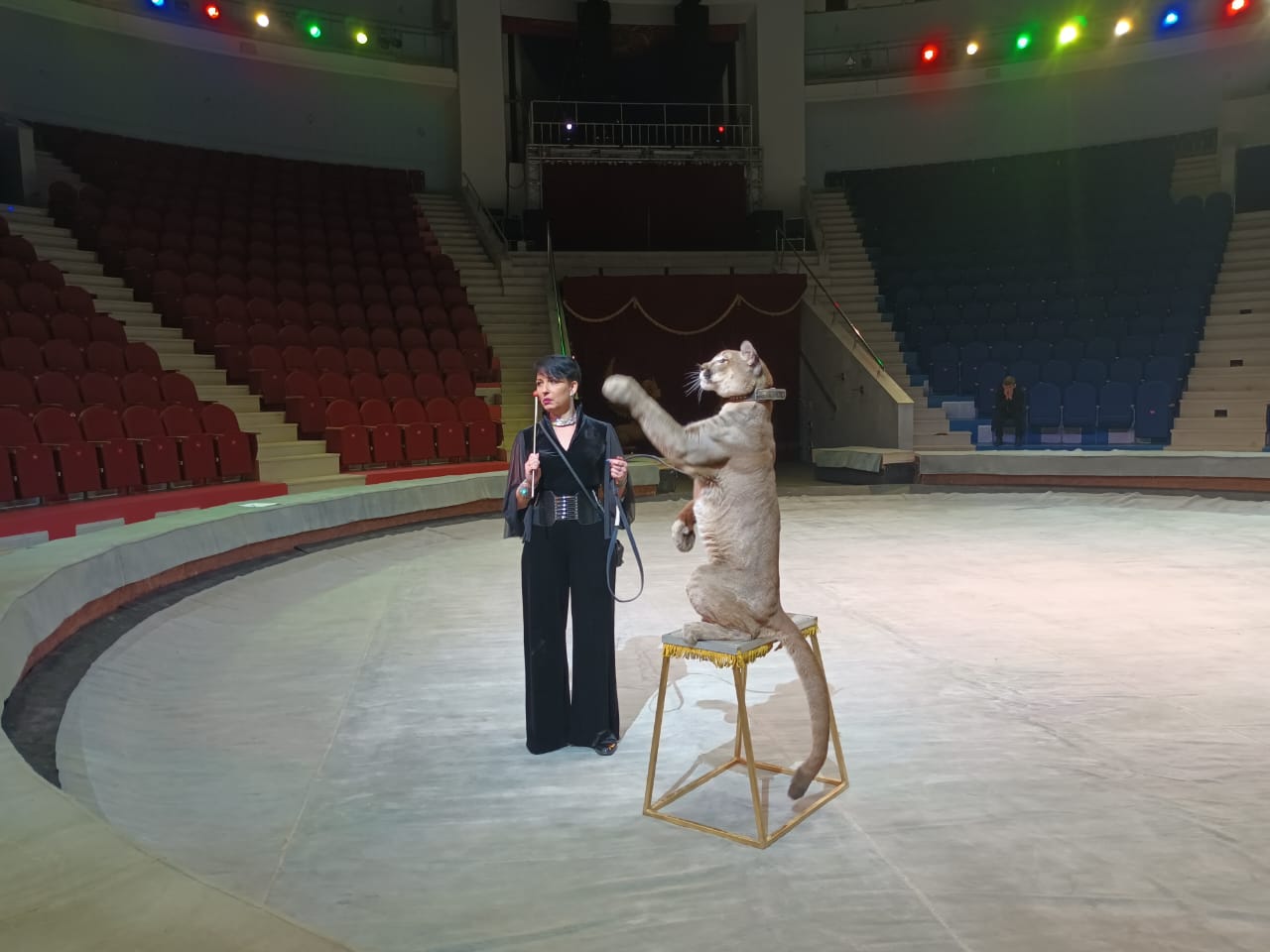 «Наша особенность в том, что мы работаем без клетки, на поводках. Вообще, пума – чудесное животное. Очень красивое, очень грациозное. В среднем на отработку одного трюка нужно полгода. Здесь многое зависит от кошки. И вот за 12 лет работы все стало хорошо», — говорит дрессировщица пум Наталья Исайчева.