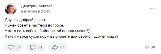 Глава администрации Тулы Дмитрий Миляев продолжает налаживать общение с жителями города в социальных сетях. Вечером 3 октября Миляев попросил у подписчиков совета в частном вопросе. Судя по всему, руководитель купил щенка, и столкнулся с выбором — чем кормить маленького мопса (с поставками некоторых кормов для животных сейчас наблюдаются проблемы).