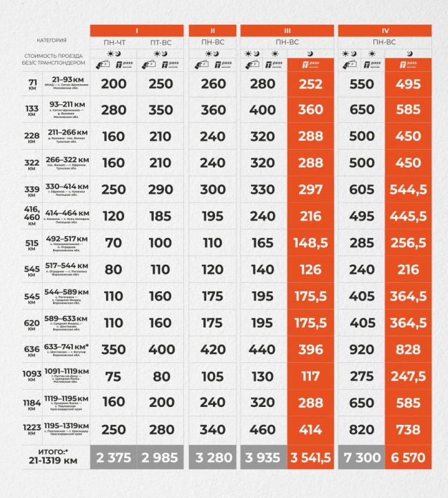 Так, чтобы проехать через пропускной пункт на 133-м километре дороги придется заплатить 280 рублей в будни и 350 в выходные (ранее — 260 и 325 рублей соответственно). При выезде из Тульской в Липецкую область также придется заплатить на 30 и 40 рублей больше в будни и в выходные соответственно. Не изменилось стоимость проезда по М-4 в Богородицком и Ефремовском районах.