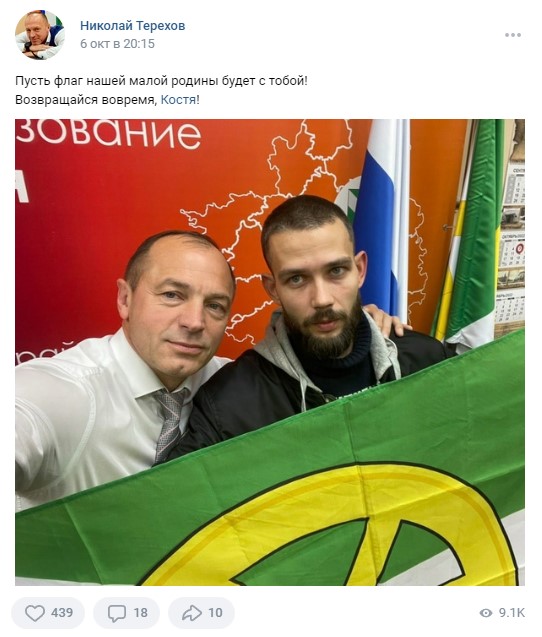 В начале октября чиновник опубликовал фотографию с местным жителем, который вступил в ряды добровольцев и отправился на специальную военную операцию. Пост стал самым просматриваемым и популярным на странице Николая Терехова за неделю — он набрал более 9 тысяч просмотров, более 400 лайков, 10 репостов и 18 комментариев. Жители района пожелали удачи земляку.