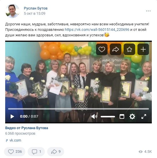В другой своей публикации Руслан Бутов разместил видео с поздравлением местных учителей с профессиональным праздником. В кадре он находился в окружении преподавателей. Видео чиновника набрало более шести тысяч просмотров, а сам пост — 4,5 тысячи.