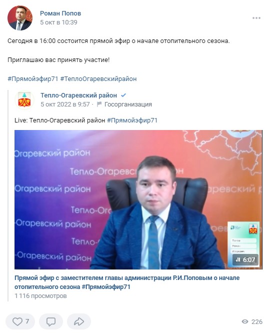Личную страницу Роман Попов начал вести 26 сентября, и уже сейчас на ней заметна активность. Чиновник публикует по несколько постов в день, уже сейчас на странице исполняющего обязанности главы администрации есть достойные посты. Например, после возложения на него новых обязанностей, чиновник успел провести прямой эфир по вопросам пуска отопления в группе администрации. На своей странице он разместил репост из сообщества и пригласил подписчиков присоединиться к трансляции.