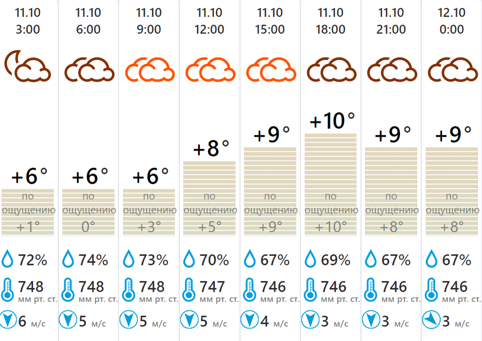 В Туле во вторник 11 октября синоптики прогнозируют пасмурную погоду и до 10 градусов тепла. Об этом сообщает центр погоды «Фобос». Днем ветер не поднимется выше 5 м/с, атмосферное давление ожидается на уровне 746-747 мм рт. ст. Влажность воздуха — около 70%.