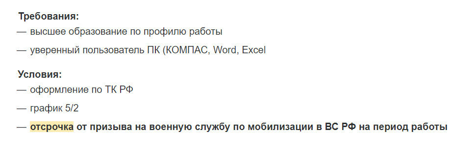 В графе «условия труда», помимо указания о полной занятости, есть пометка: «отсрочка от призыва на военную службу по мобилизации в ВС РФ на период работы».